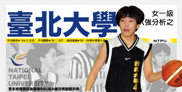 96學年起挑戰一級,臺北大學就獲第七,97學年無緣八強,上季未通過預賽,掉到外卡賽掙扎才重返前八,且同以第七名作收, 本季又循一樣模式,拚外卡賽拿到八強門票。 rn rn烏巧璇、鍾佩庭畢業,北大本季剩八名體保生撐場,預賽12隊的最迷你,卻是精實部隊,人人可上場,先發、替補差不多,沒明顯主、副將之分,共同點是前、後場球員都不高,第一長人出身HBL「小綠綠」北一女的大一先發中鋒陳雯卉僅172公分,幾沒啥內線戰力。 rn rn但弱勢也是優點,來自五所高中的八人,個個有三分球絕技,北市南湖高中前後期隊友大三後衛周孟璇、大二前鋒陳蓮娟、大二主控雲敏惠,尤是佼佼者,永平高中畢業的隊長168公分大四前鋒郭筱絹,北一女出來的大三後衛董雅蕙、甫離開陽明高中的大一菜鳥方翊宸,乃至出身基隆安樂高中的大四後衛張若俞,也悉為三分線高手。 rn rn主力搭配多年,默契絕佳,速度也不錯,擅團隊作戰,第五年掌兵符的教頭張維仁說,最弱一環在禁區,高度、對抗性不足,加上讀的又非體育科系的企管等,功課重、練球短,撐完本季備極辛苦,預賽加外卡八戰平均得69.1分、失62.1分。