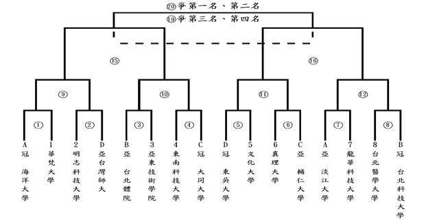 今(29)日召開大專籃球聯賽一般男生組第一區賽事會議,四組預賽冠亞軍隊伍為種子,三四名隊伍由抽籤方式排入。抽籤名單為:華梵大學、明志科技大學、亞東技術學院、東南科技大學、文化大學、真理大學、龍華科技大學、台北醫學大學。最終分組賽程表見上圖。
