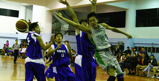 中華科大周鈞哲與亞東學院王凱新爭搶籃板球。