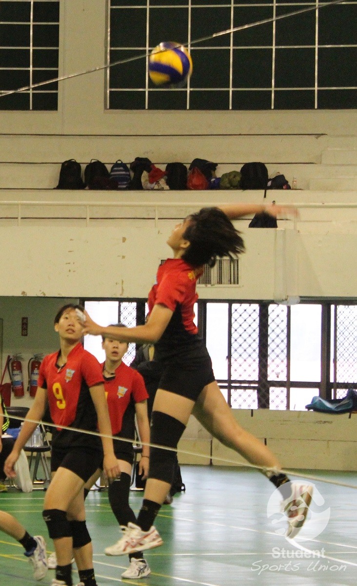 首局一開始雙方各有攻勢,但到了7:7時,文化大學靠著王昱蓉的犀利發球,讓國立體大難以招架,拉出一波七分的攻勢,比數來到14:7。不過落後的國立體大並不因此氣餒,在局末急起直追,將文化大學逼到duce的局面,最後連拿三分,成功以27:25拿下第一局。