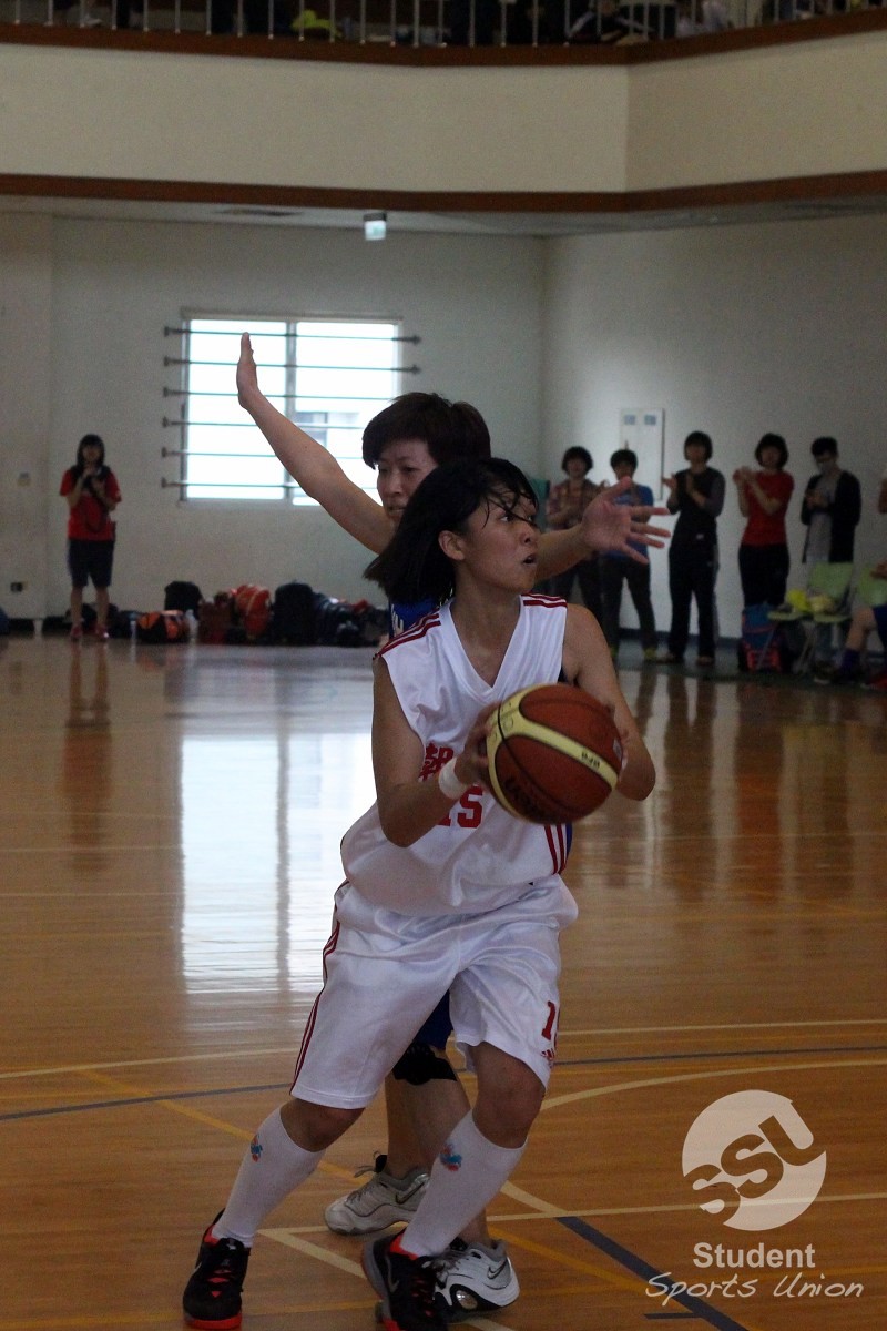 雙方在上半場的戰況呈現膠著的情況,朝陽自以往就是「快」的代表,但今天東海則改用「慢」的方式來應戰,在半場進攻上不斷的放慢節奏,利用球員和球位置的輪轉,趁防守球員錯位的時候切入、跳投得手,但是朝陽也不是省油的燈,識破對手套路之後,算準時機抄截快攻得分;但雙方在上半場無論進攻、防守都出現不少失誤,朝陽在第二節開節攻下四分後便遲遲無法得分,東海許雅婷、蔡宜玫兩人聯手攻下一波6:0的小高潮,逼得朝陽趕緊喊出暫停,上半場結束東海僅以兩分,21:19些微領先朝陽。