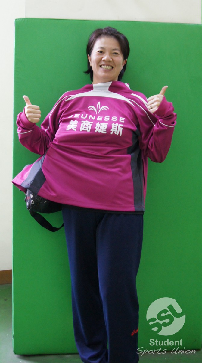 輔仁教練陳儷勻秀出廠商贊助的衣服。