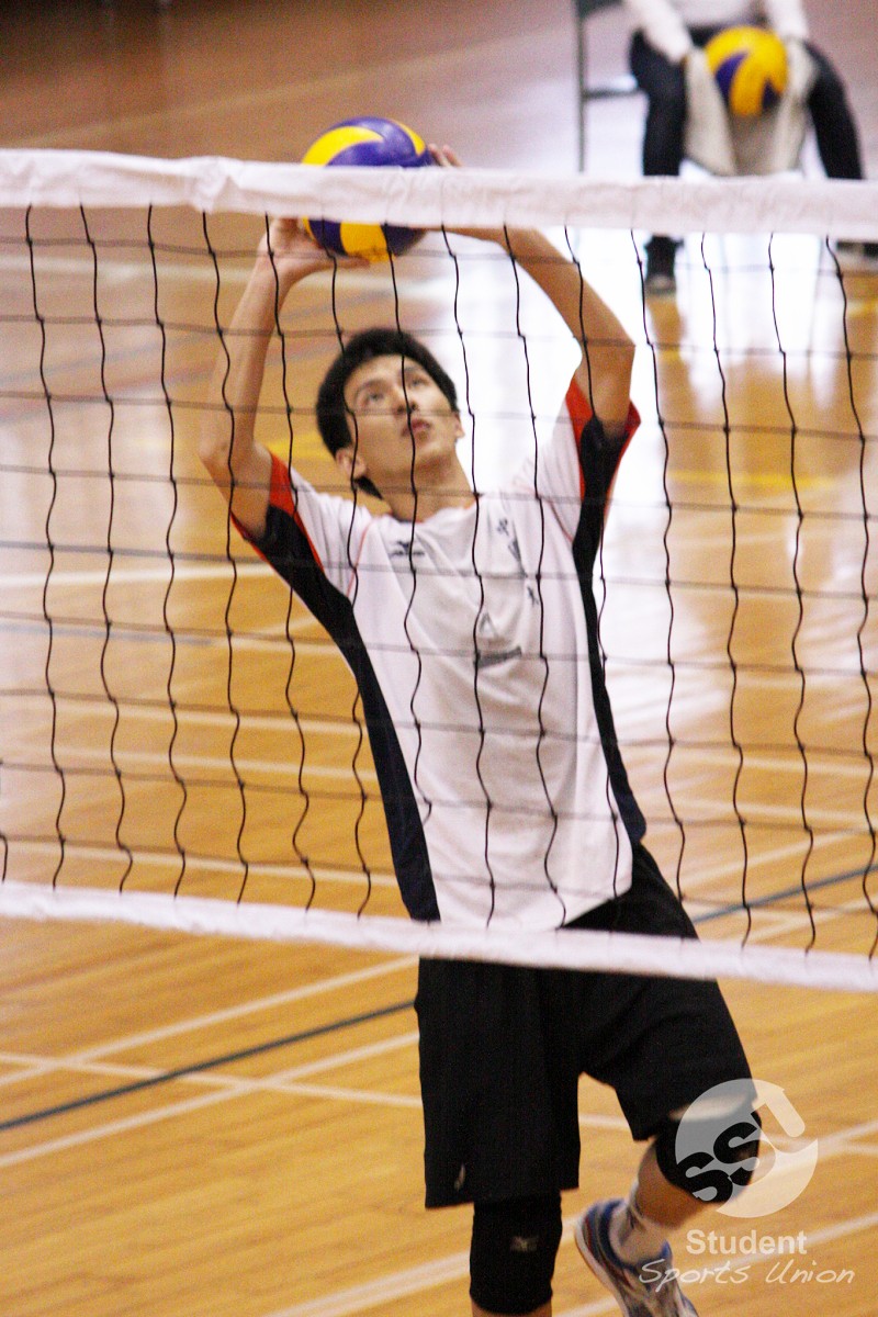 首局,雙方便展開拉鋸,前半段國北教攻守得宜,開局打出一波7:5略居上風,慢熱的中國醫大則緊咬比分,靠著11號蕭富城多次強攻得手,逐漸將比分超前,逼得國北教喊出暫停。暫停後,國北教製造對手多次接發球不順,將比數追到22:23一分落後,中國醫大保險起見也喊出暫停。溝通後,11號蕭富城適時挺身而出,漂亮演出一記扣殺,加上國北教發生失誤,中國醫大25:22率先搶下第一局。