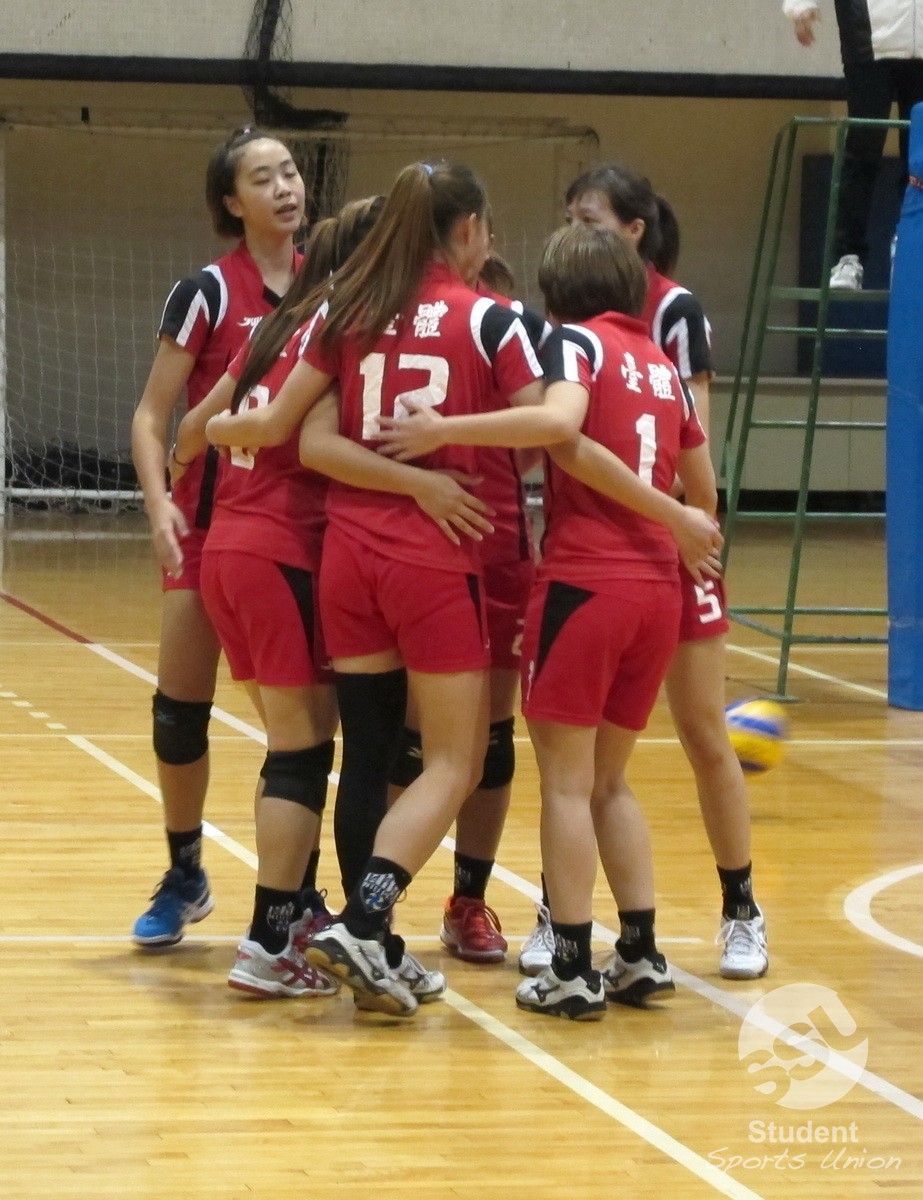 首局,臺體大靠著地主交大還未進入狀況,靠著發球接連得分,使得交大在第一局只拿下8分。休息過後,交大終於漸漸進入狀況,雙方多次來回球,也使交大更有信心,李妍葶攻擊加上翁珮珊多次吊球,使臺體大亂了腳步,而交大也靠著地主優勢、全場的歡呼聲,將交大氣勢帶到最高點,但臺體大也不放棄,潘姿怡也在攻擊上非常出色,此局打得非常激烈,雙方皆用了兩次暫停,在20:20交大逆轉臺體大,但臺體大楊斯涵攻擊再將比數追回來,雖然比數在21:22時因出界球爭議,使得交大落後兩分,因而使交大氣勢更高昂再將比數拉平為23:23,但在最後交大接球失誤使得臺體大第二局以26:24,險勝交大。