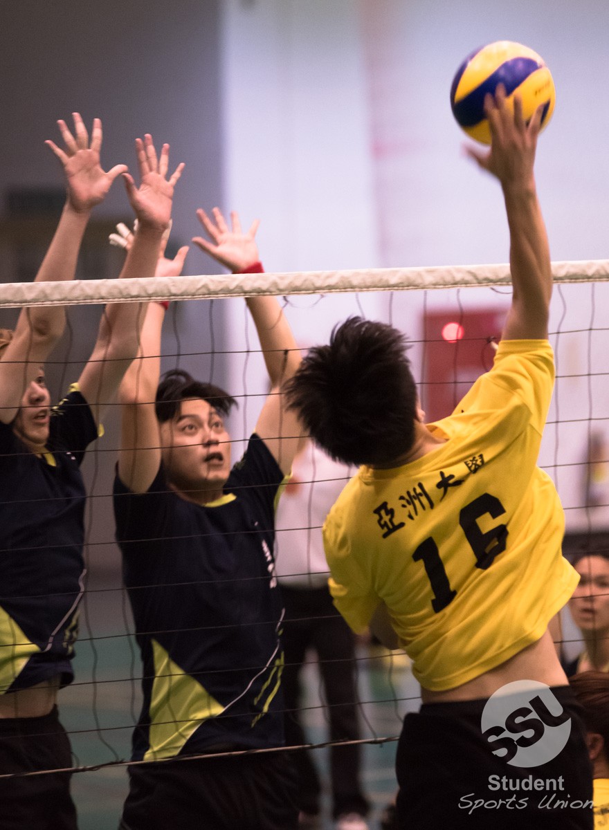 一開賽,雙方皆在適應,打起來稍顯混亂,兩隊頻頻出現嗆司,比分一路僵持不下,直到第一次暫停後,由於亞洲大學發球失誤高達五次之多,玄奘大學開始拉開比分,玄奘大學陳贊能攻擊打點,成功打出一波波精彩攻擊;而亞洲大學因反攻力道過猛,屢屢出界,造成失分,讓玄奘大學最後以25:22驚險拿下首局。