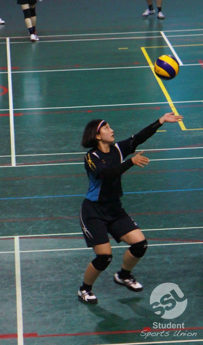 第一局長庚就展現出地主的氣勢,兵來則將擋。多次的攻擊讓中科久攻不下,林孟萱也在10:5時積極得分,將球從界線遠處救回,再由攻擊手林品舒跳殺拿下分數,獲得全場喝采。這也逼著中科喊了暫停改變策略,但因默契不佳致多次的失分,首局以23:25兩分之差敗給長庚。